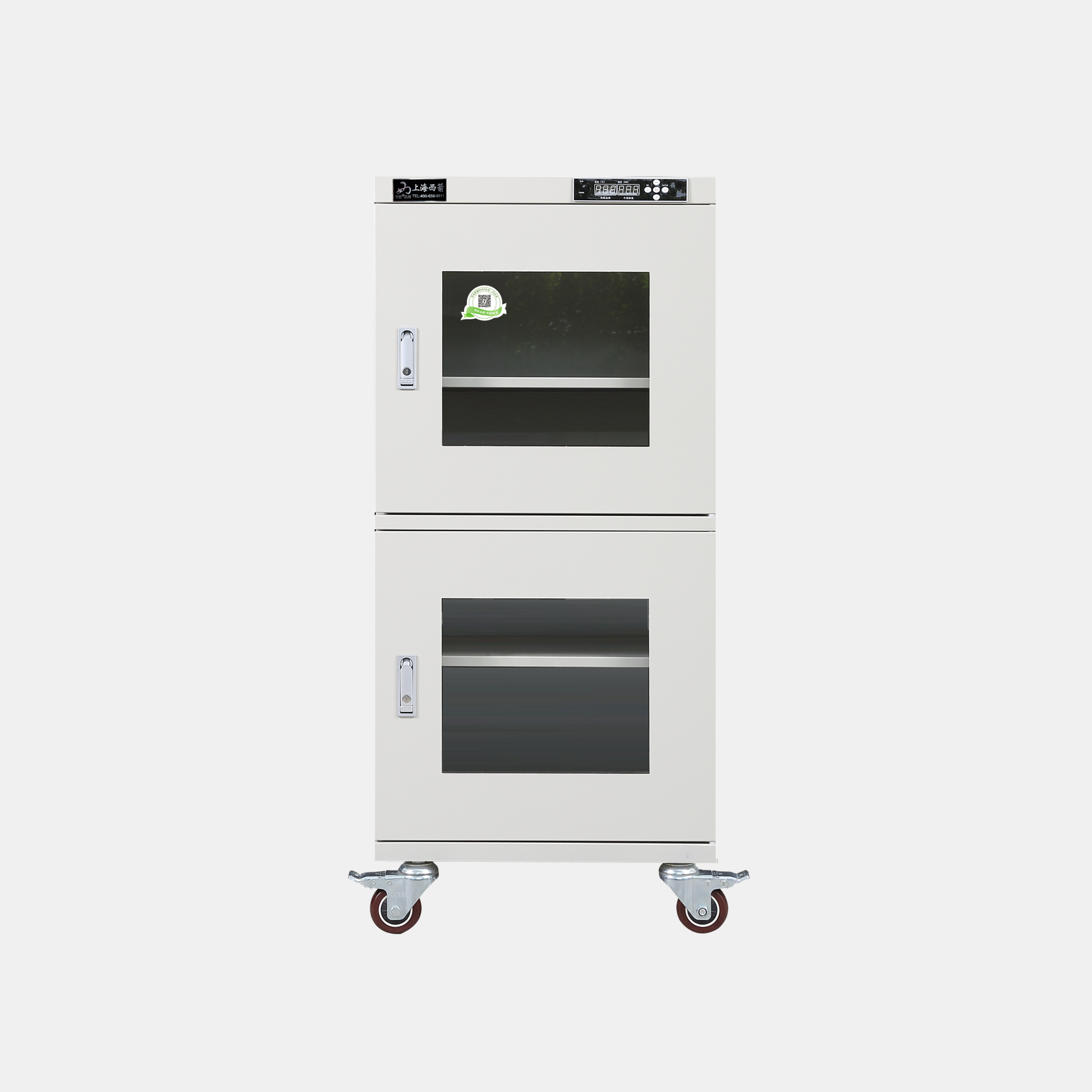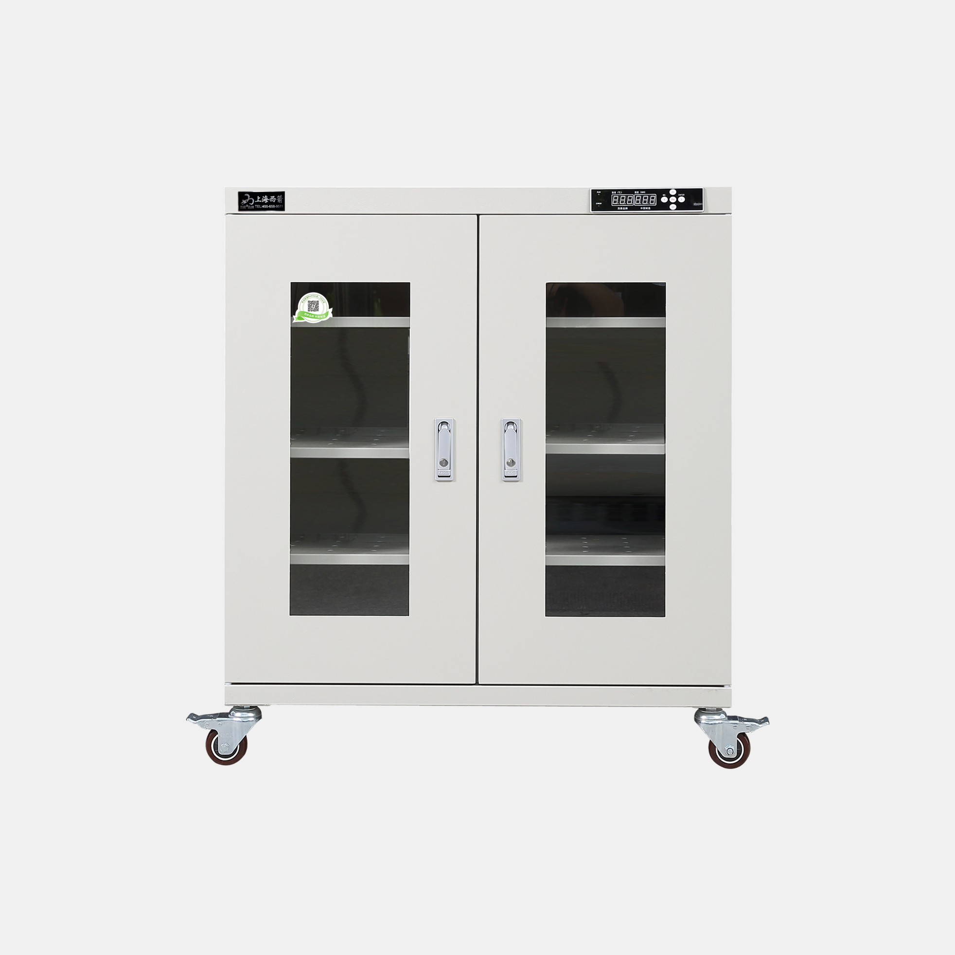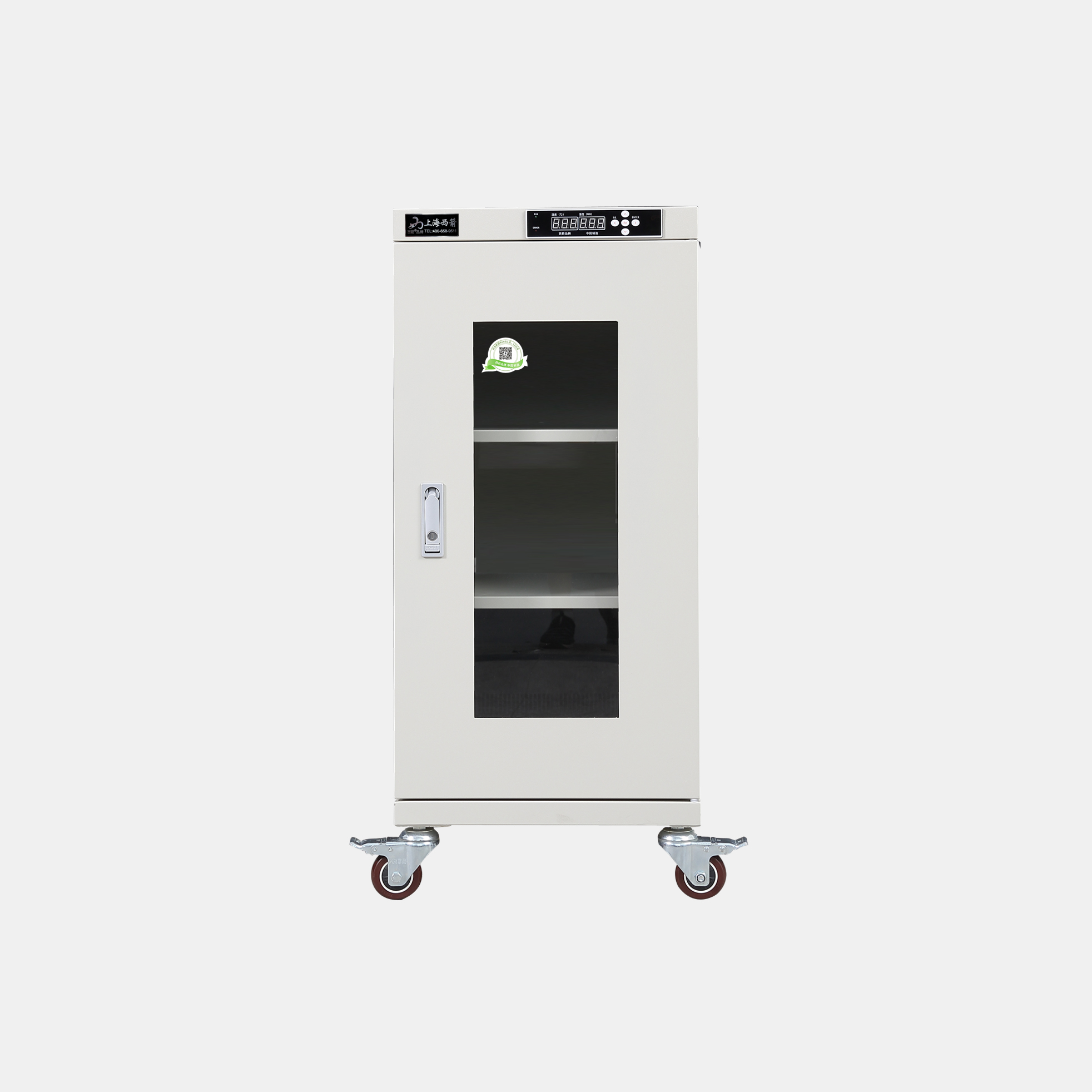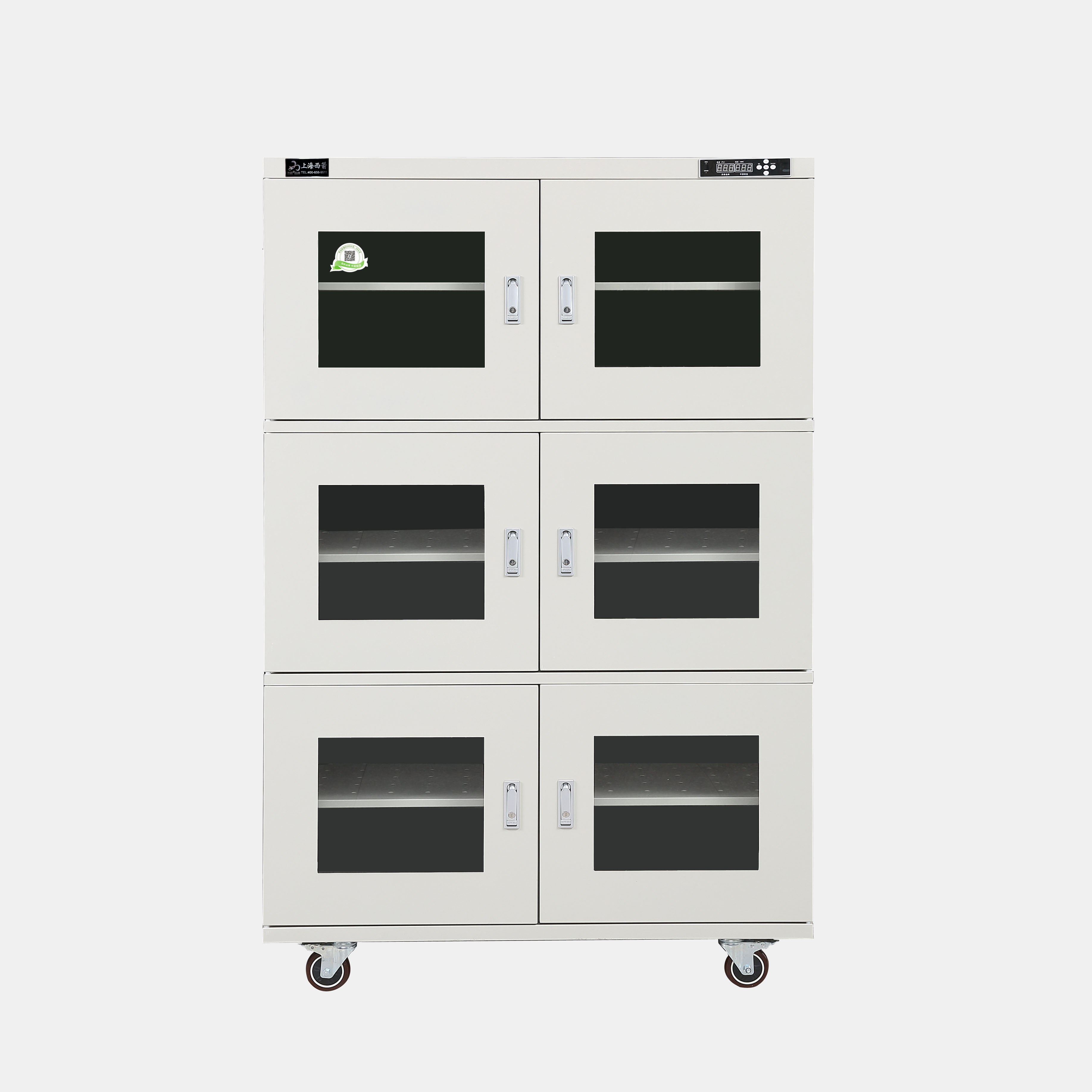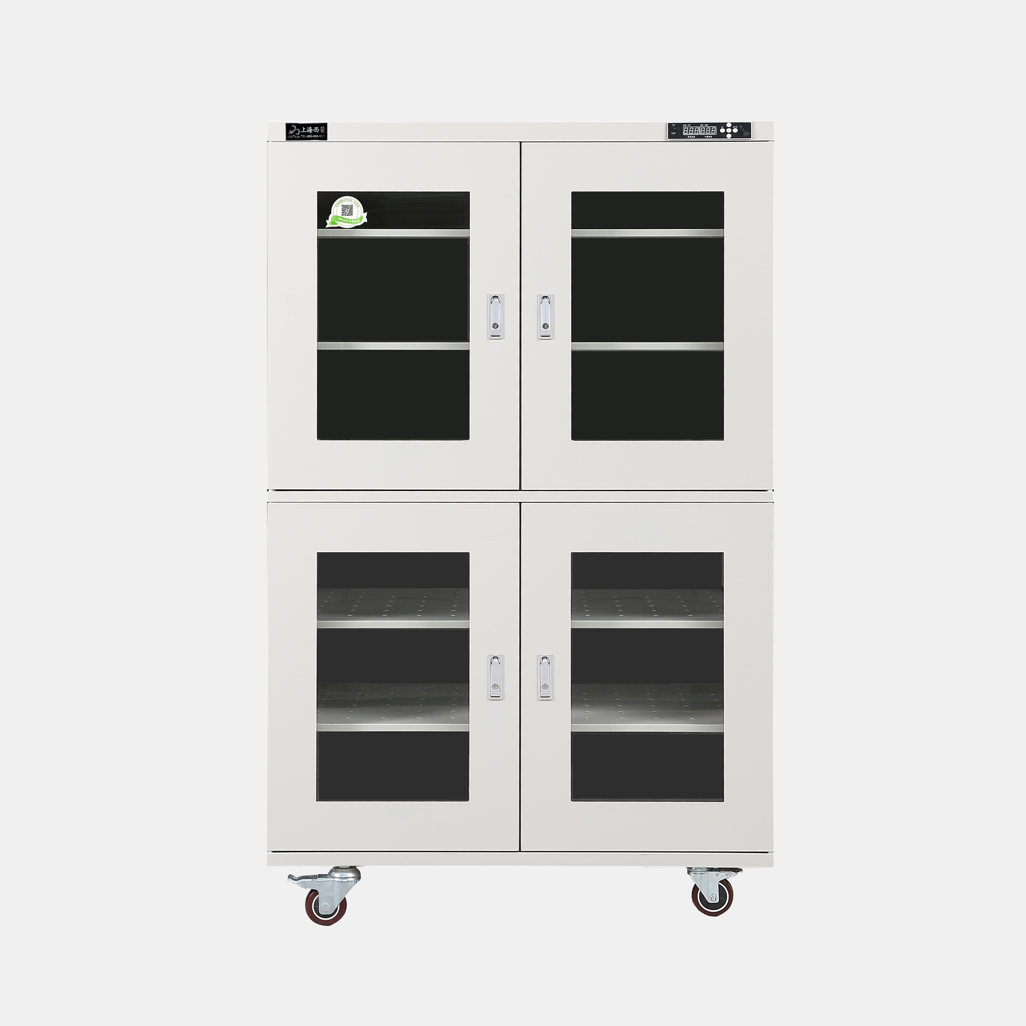 3.防潮箱門玻璃區域選用3.0mm鋼化玻璃,防前傾耳式結構設計。帶平面加壓把手鎖*體化設計,有防盜功能。**部安裝可移動帶剎車腳輪方便移動及固定(防靜電機型腳輪為防靜電)。