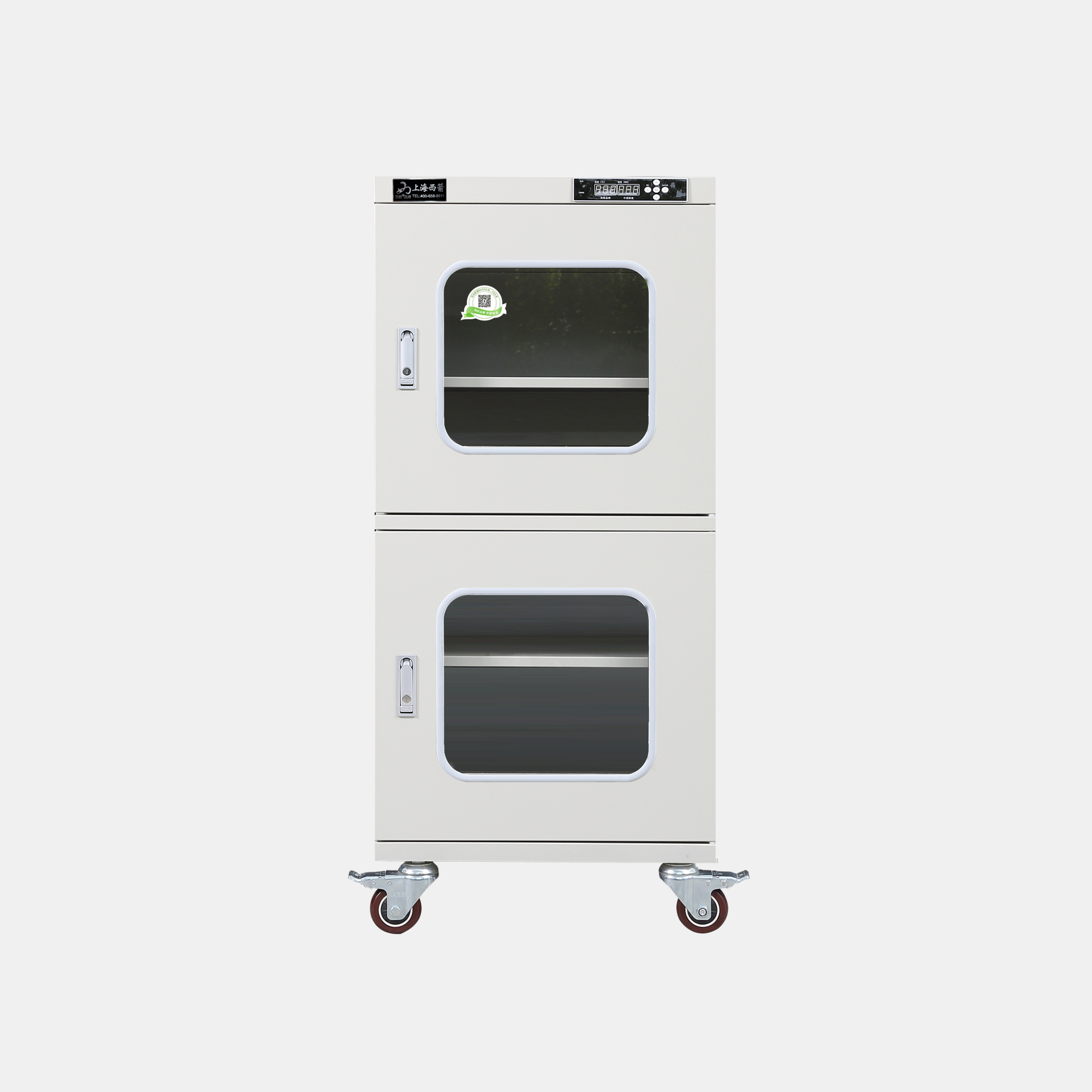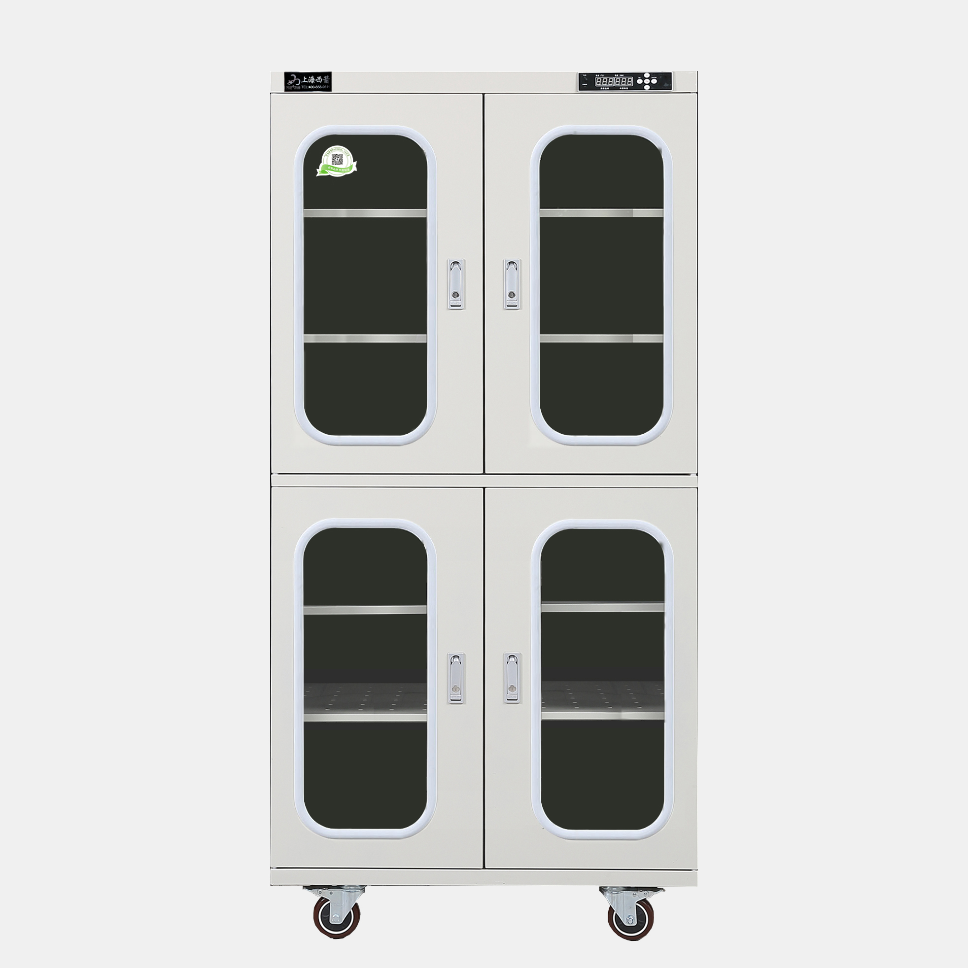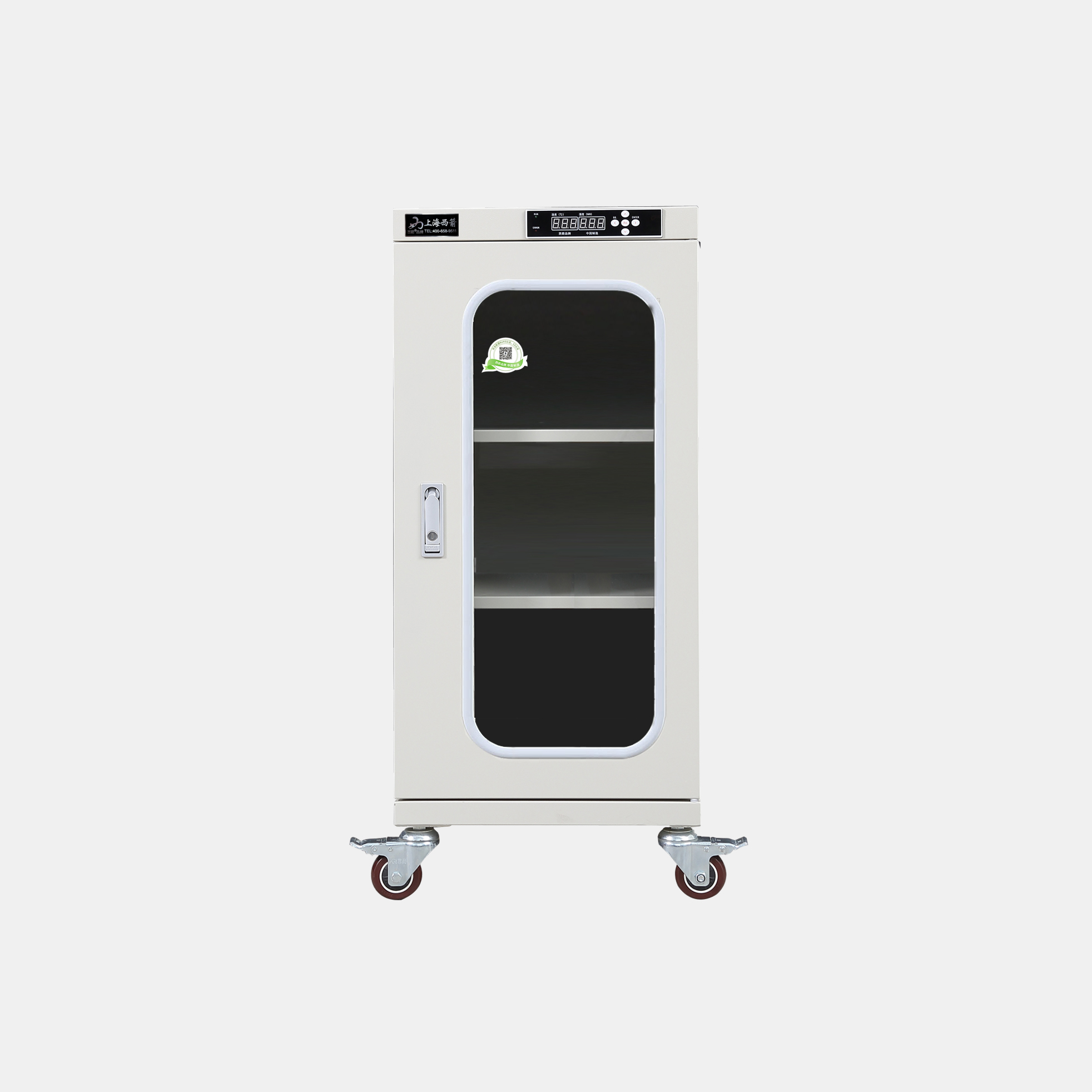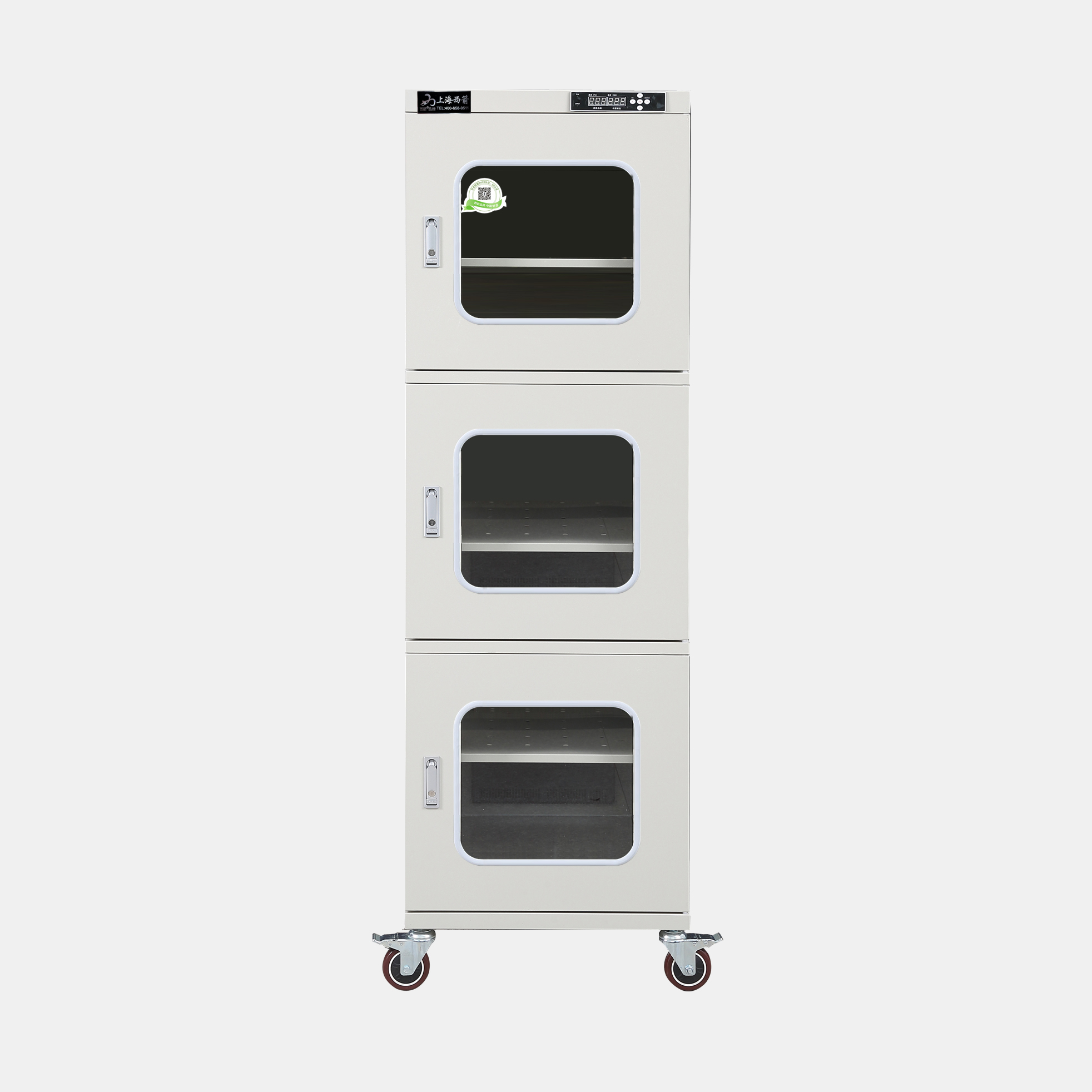 3.防潮箱門玻璃區域選用3.0mm鋼化玻璃,防前傾耳式結構設計。帶平面加壓把手鎖*體化設計,有防盜功能。**部安裝可移動帶剎車腳輪方便移動及固定(防靜電機型腳輪為防靜電)。